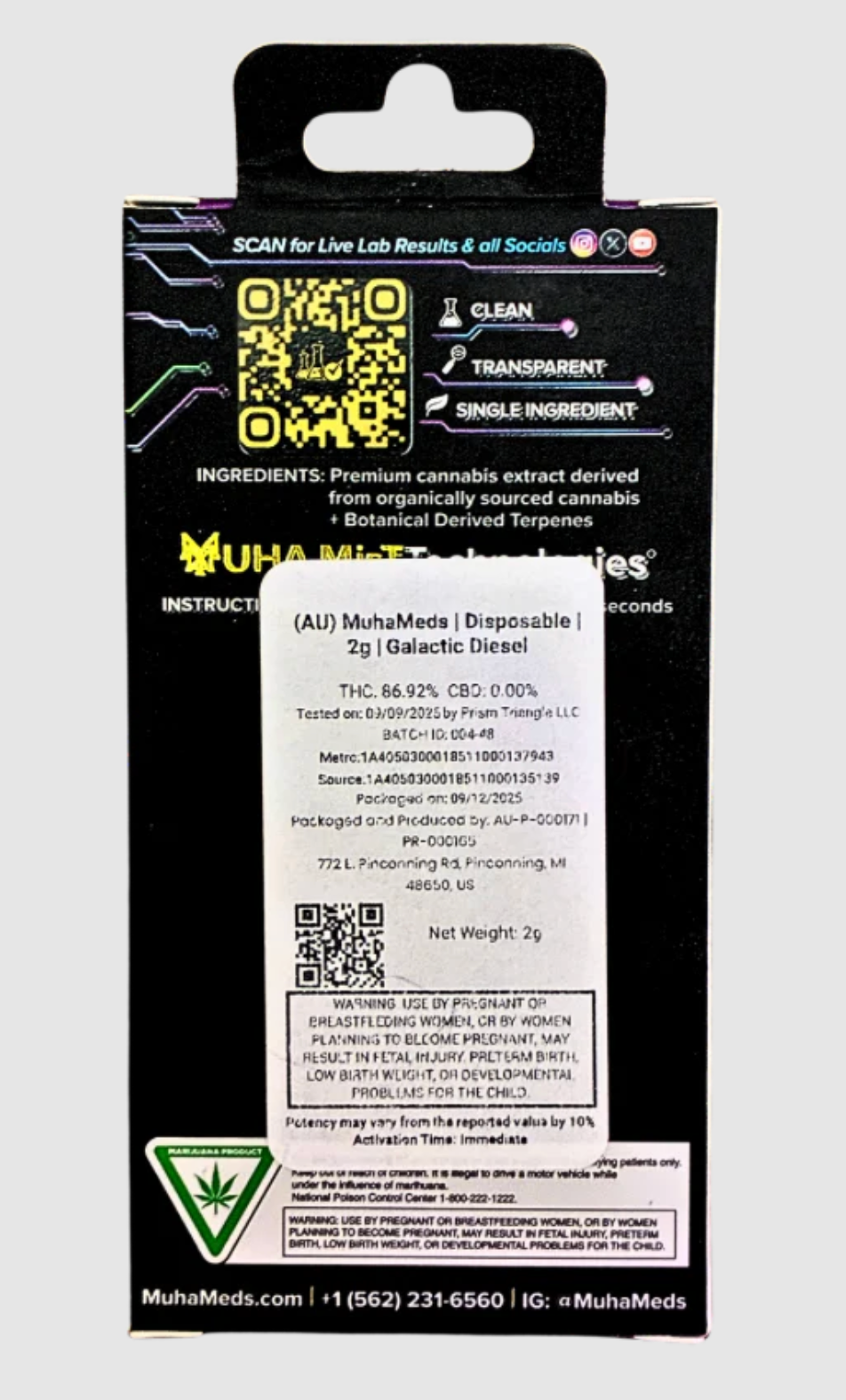 Each Muha Meds Galactic Diesel is packaged in sleek, modern, child-resistant packaging that reflects the product’s premium quality. Designed to preserve freshness and ensure safe storage, the packaging enhances the overall sophistication of muha bar’s offerings.